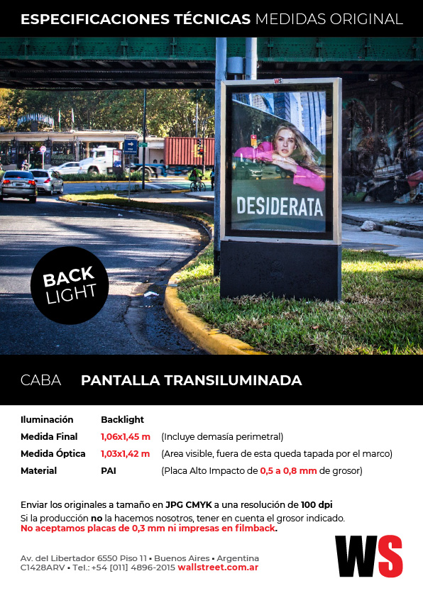 Las pantallas transiluminadas integran circuitos exclusivos por encontrarse ubicados en zonas estratégicas de la Ciudad de Buenos Aires. Es ideal para campañas en mercados específicos a nivel geográfico y demográfico, obteniendo así la máxima cobertura y frecuencia en el segmento buscado. Este dispositivo es apropiado para las acciones publicitarias que tienen como destino la recordación de marca o el lanzamiento de nuevos productos.